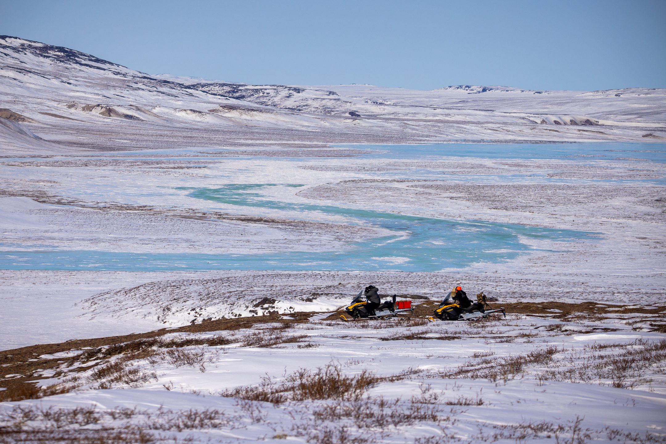 Our camp sits on the southwest end of the peninsula, just over a hundred miles from Cambridge Bay. On average, the trip from Cambridge Bay to camp takes about seven hours with snowmobiles.